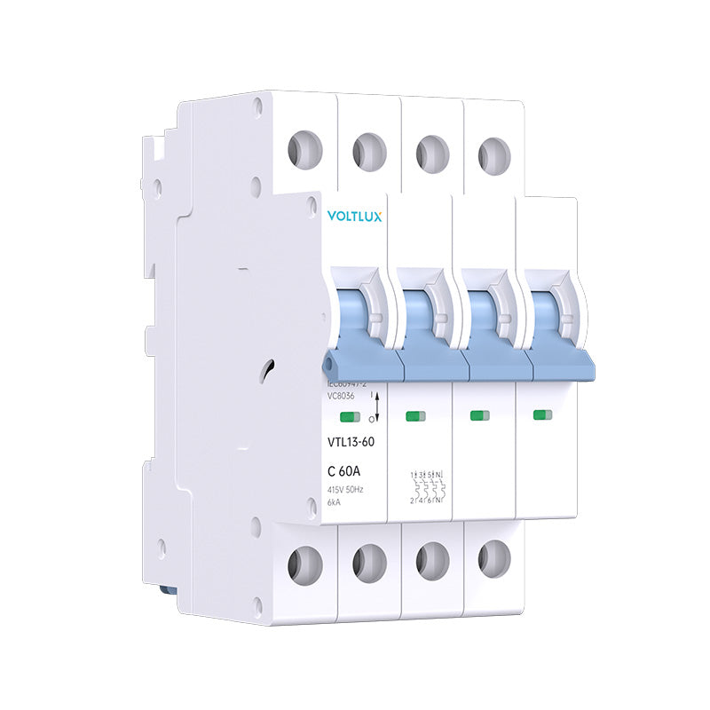 VTL13-60 series 13mm small circuit breakers have functions such as short circuit protection, overload protection, control, isolation, etc. This series of circuit breakers is suitable for low-voltage termina distribution line protection in industries such as industrial, civil buildings, energy, communication and infrastructure, with an AC frequency of 50Hz/60Hz, a rated working voltage of AC240/400V and a rated working current of 63A.